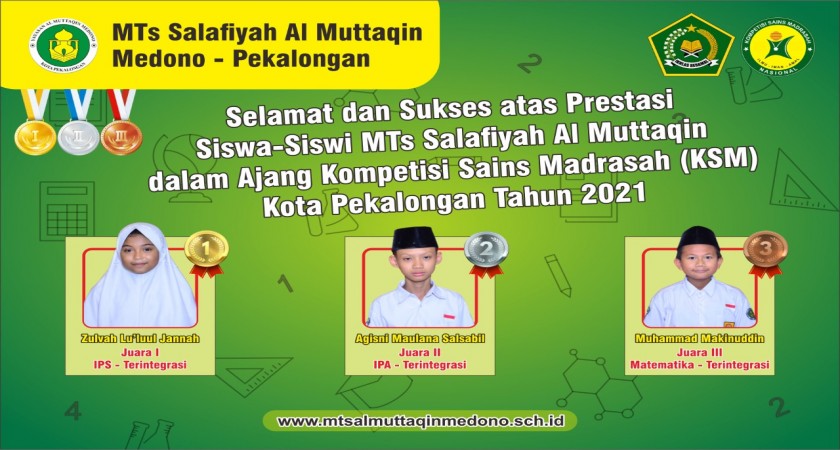 Puji syukur kehadirat Allah SWT, dalam ajang KSM (Kompetensi Sains Madrasah) Tahun 2021 tingkat Kota Pekalongan yang dilaksanakan pada Ahad 22 Agustus 2021 kemarin secara online, madrasah kita tercinta, MTs Salafiyah Al Muttaqin dapat meraih juara pada tiap cabang lombanya.