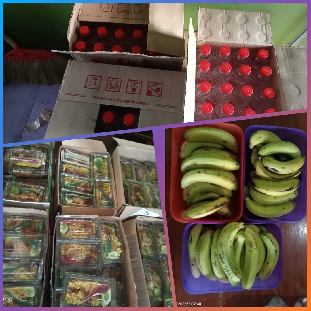 Menu sarapan bersama (nasi kuning, air putih botol besar, dan buah pisang)